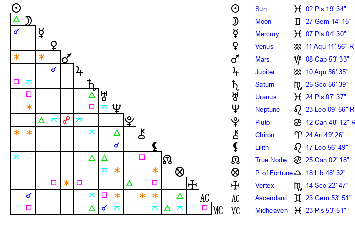 | Sun | 2 Pisces 20 | 3 Pisces 19 | 9 Gemini 28 |