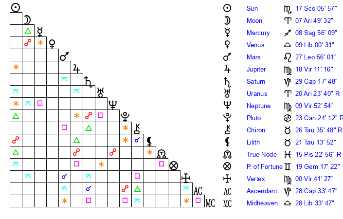 | Sun | 17 Scorpio 6 | 17 Scorpio 33 | 21 Aquarius 32 |