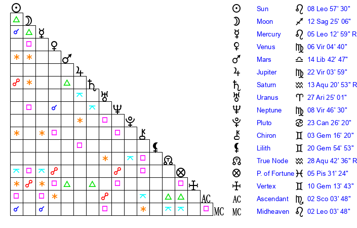 | Sun | 8 Leo 57 | 9 Leo 42 | 8 Scorpio 49 |