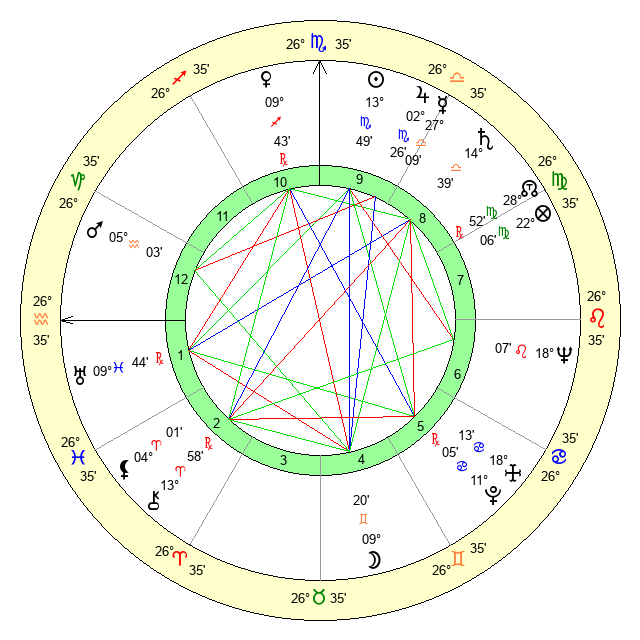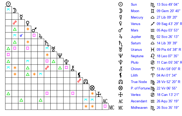 | Sun | 13 Scorpio 49 | 15 Scorpio 5 | 27 Aquarius 20 |