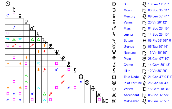 | Sun | 13 Leo 17 | 14 Leo 29 | 11 Scorpio 21 |