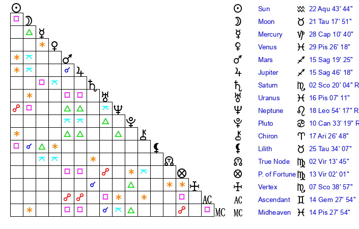 | Sun | 22 Aquarius 43 | 24 Aquarius 14 | 2 Gemini 15 |
