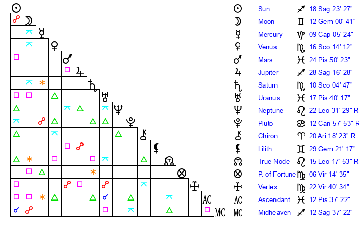 | Moon | 11 Gemini 59 | 5 Virgo 12 | 23 Aquarius 16 |