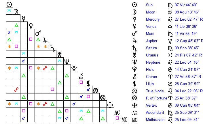 | Sun | 7 Virgo 45 | 8 Virgo 32 | 17 Sagittarius 8 |