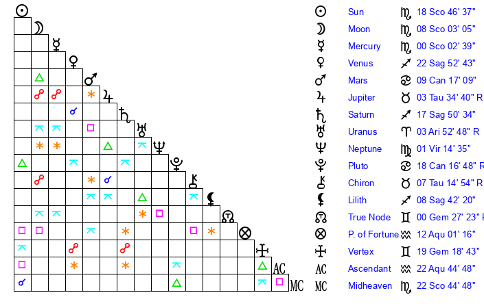 | Sun | 18 Scorpio 47 | 19 Scorpio 16 | 27 Aquarius 16 |