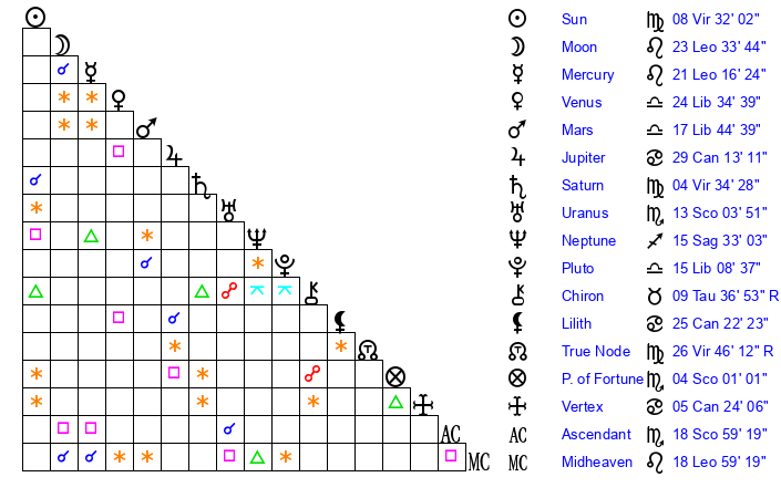 | Sun | 8 Virgo 32 | 9 Virgo 9 | 24 Libra 35 |