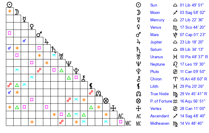 | Moon | 4 Sagittarius 0 | 15 Scorpio 55 | 1 Virgo 36 |