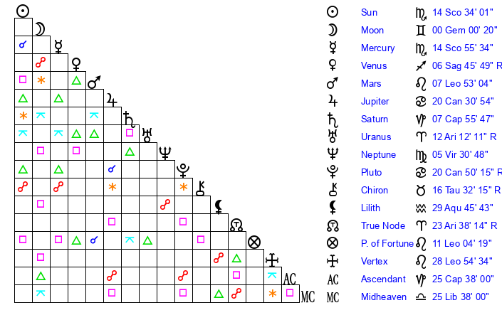 | Sun | 14 Scorpio 34 | 15 Scorpio 32 | 21 Aquarius 0 |
