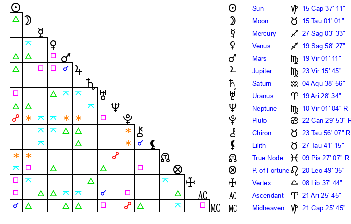 Moon | 15 Taurus 0 | 8 Aries 10 | 18 Virgo 55 |