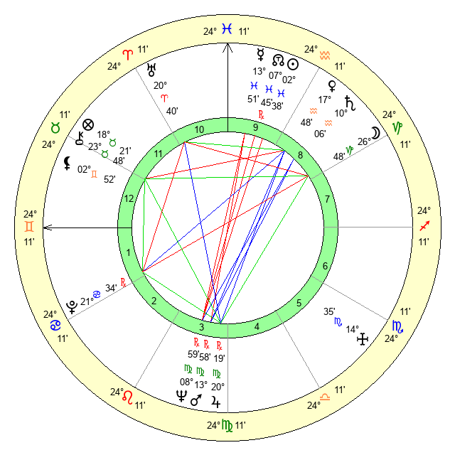 | Sun | 2 Pisces 38 | 3 Pisces 19 | 3 Gemini 3 |