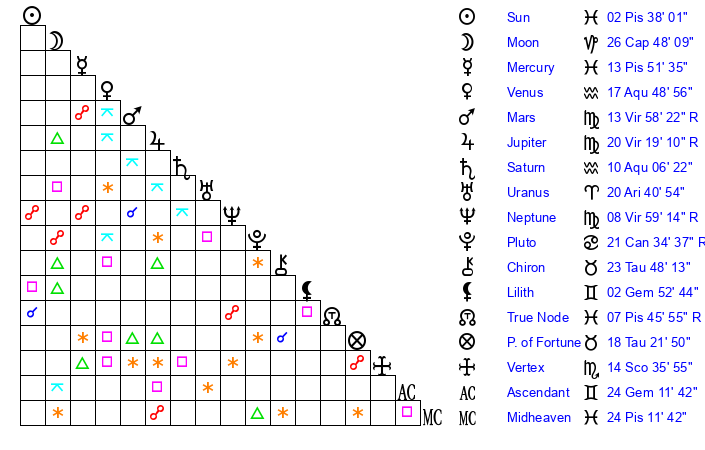 | Neptune | 8 Virgo 58 | 28 Pisces 38 | 7 Virgo 24 |