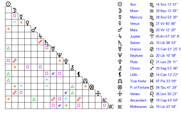 | Sun | 14 Scorpio 13 | 15 Scorpio 17 | 29 Capricorn 20 |