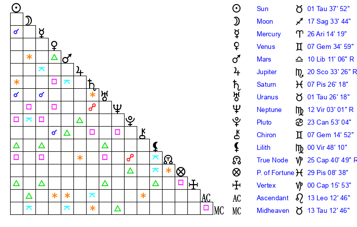 | Moon | 17 Sagittarius 36 | 22 Aquarius 59 | 13 Aries 23 |
