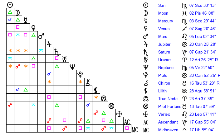 | Sun | 7 Scorpio 33 | 8 Scorpio 31 | 13 Aquarius 55 |