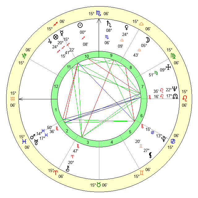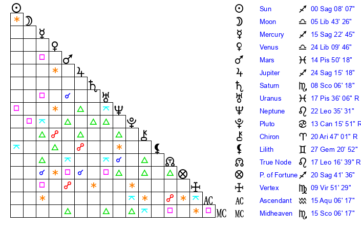 | Moon | 5 Libra 43 | 27 Sagittarius 9 | 25 Gemini 45 |