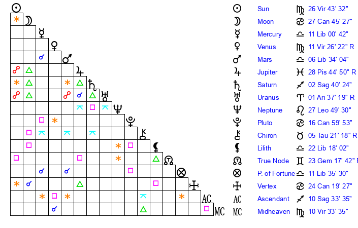 | Venus | 11 Virgo 26 | 1 Virgo 26 | 21 Scorpio 27 |