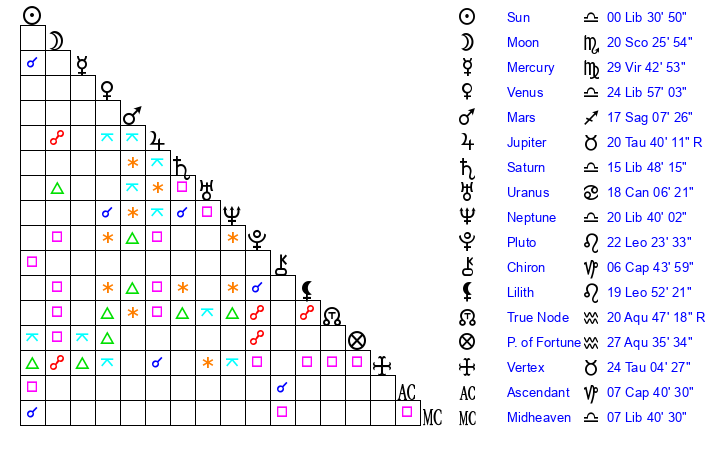 | Neptune | 20 Libra 40 | 0 Aries 44 | 23 Libra 11 |