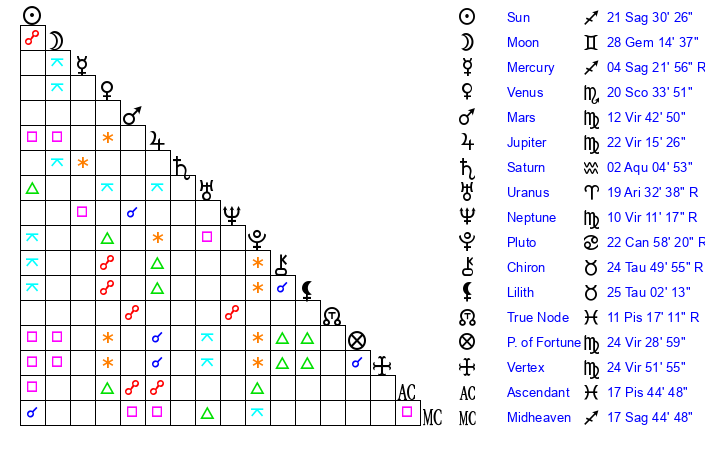 | Mercury | 4 Sagittarius 21 | 2 Sagittarius 14 | 6 Aries 52 |