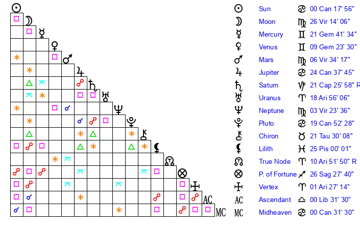 | Mercury | 21 Gemini 42 | 24 Cancer 17 | 13 Virgo 34 |