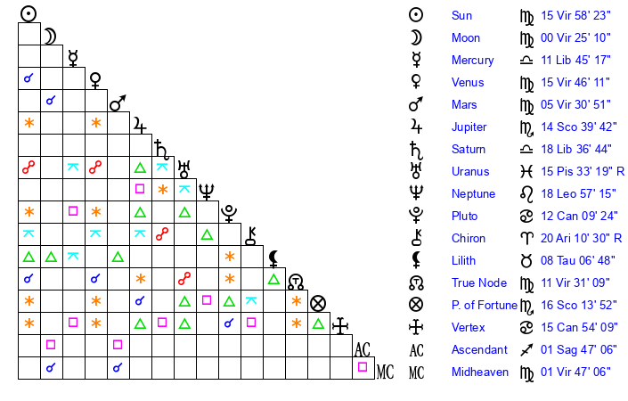 | Sun | 15 Virgo 58 | 17 Virgo 16 | 27 Sagittarius 48 |