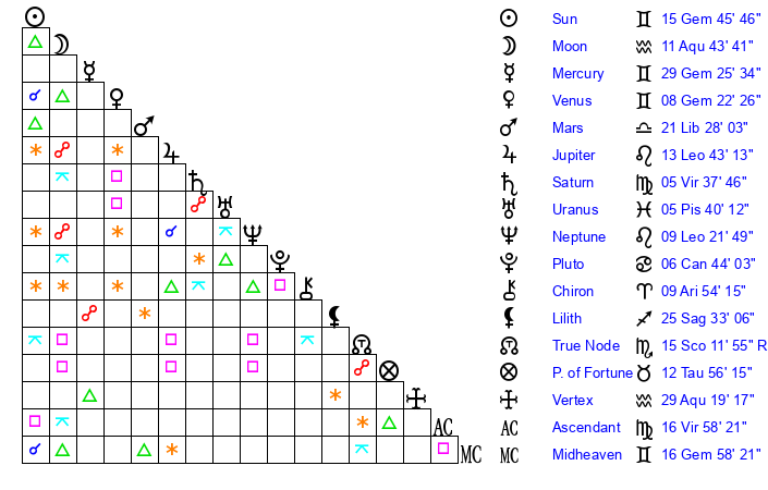 | Sun | 15 Gemini 46 | 16 Gemini 21 | 26 Virgo 33 |