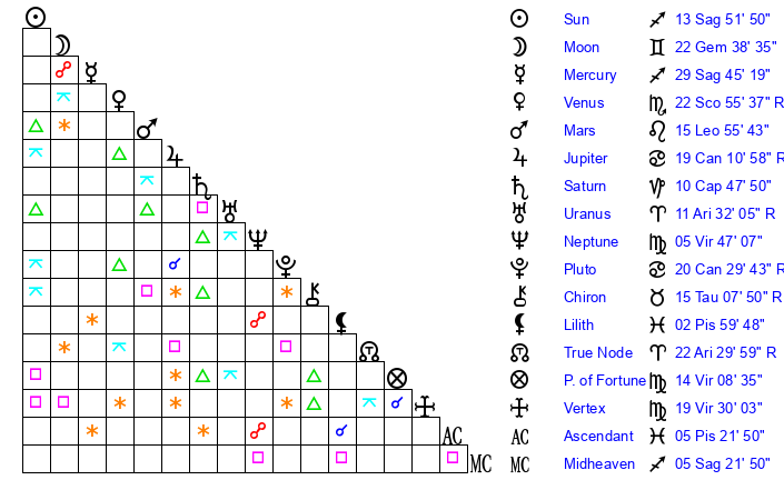 | Moon | 22 Gemini 34 | 9 Cancer 18 | 25 Sagittarius 56 |
