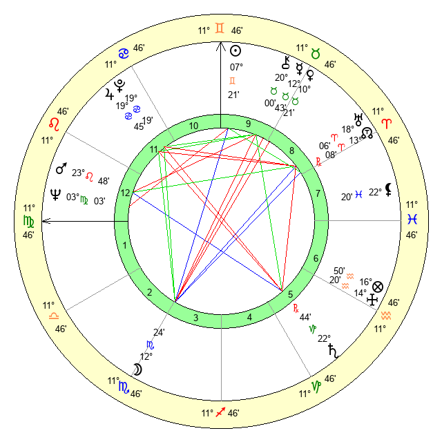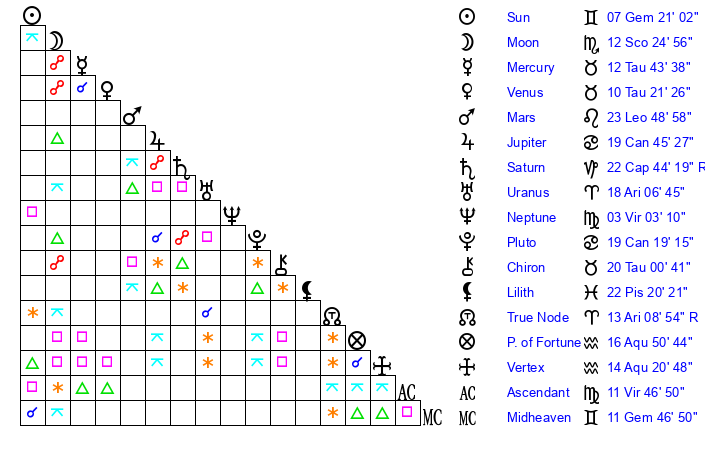 | Sun | 7 Gemini 21 | 8 Gemini 34 | 7 Virgo 19 |
