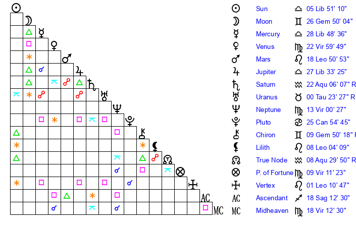 | Venus | 23 Virgo 0 | 12 Virgo 29 | 17 Capricorn 9 |