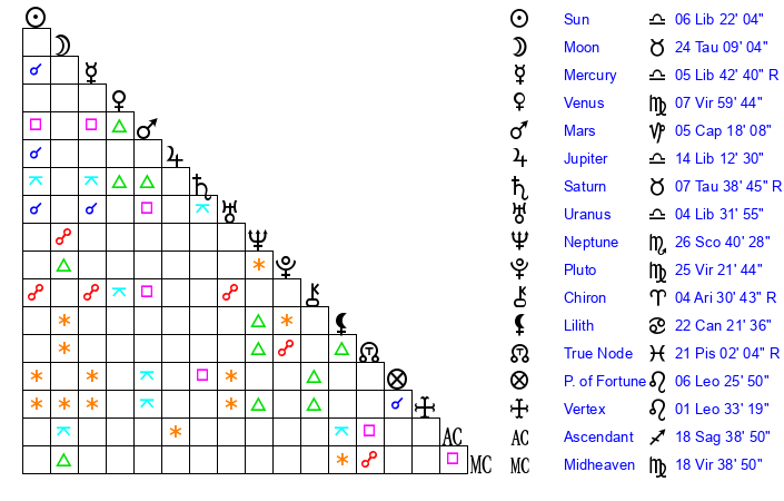 | Saturn | 7 Taurus 52 | 27 Pisces 44 | 3 Taurus 41 |