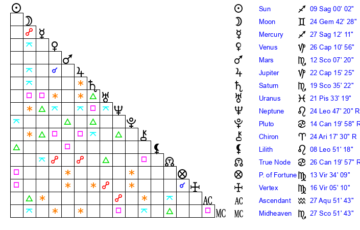 | Sun | 9 Sagittarius 0 | 9 Sagittarius 45 | 20 Pisces 22 |