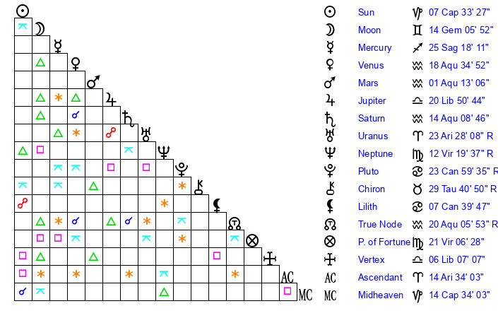 | Saturn | 14 Aquarius 19 | 14 Pisces 17 | 24 Aquarius 38 |