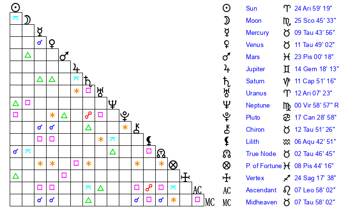 | Venus | 11 Taurus 50 | 24 Pisces 47 | 5 Virgo 48 |