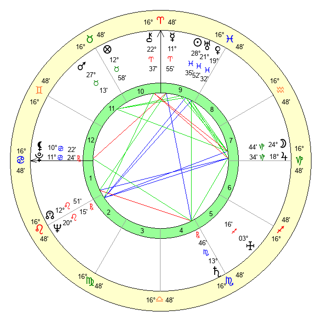 | Sun | 28 Pisces 35 | 29 Pisces 20 | 5 Cancer 30 |