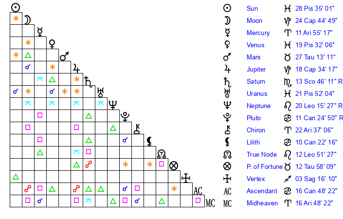 | Saturn | 14 Scorpio 20 | 22 Pisces 55 | 8 Scorpio 22 |