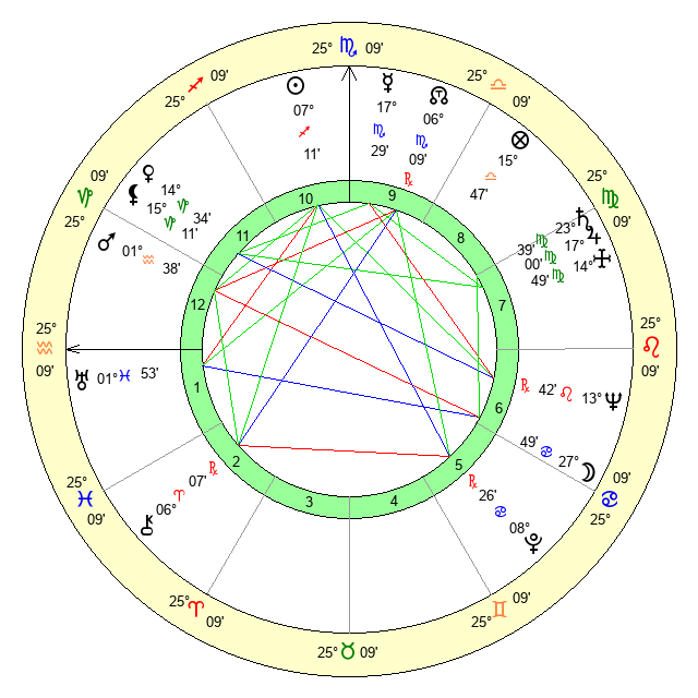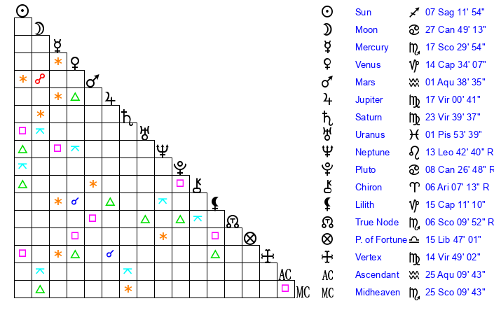 | Saturn | 24 Virgo 19 | 25 Pisces 4 | 22 Virgo 1 |