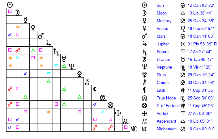 | Sun | 12 Cancer 2 | 12 Cancer 58 | 5 Libra 53 |