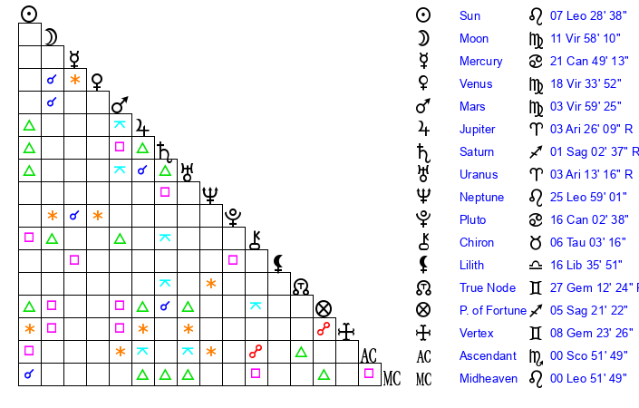 | Mars | 4 Virgo 0 | 26 Virgo 7 | 7 Scorpio 57 |