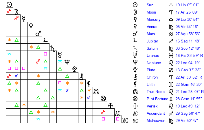| Neptune | 22 Leo 4 | 0 Aries 13 | 21 Leo 44 |
