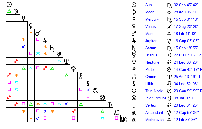 | Sun | 2 Scorpio 46 | 3 Scorpio 32 | 14 Aquarius 8 |
