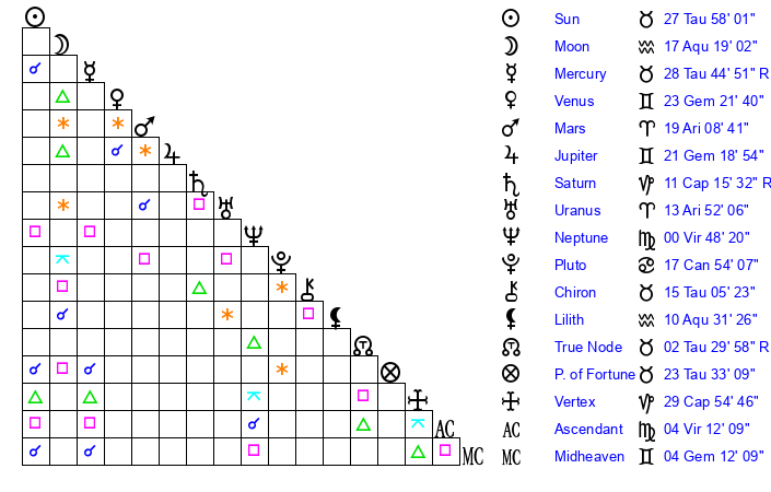 | Mars | 19 Aries 9 | 14 Leo 40 | 26 Gemini 20 |