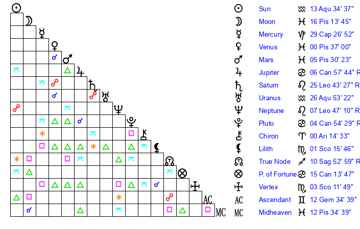 | Venus | 0 Pisces 37 | 29 Pisces 21 | 8 Cancer 48 |