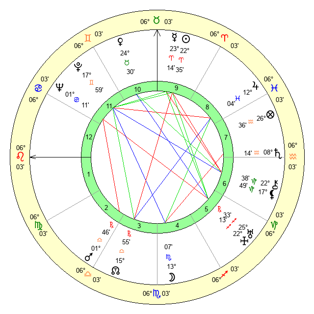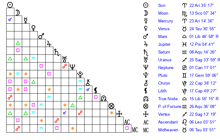 | Sun | 22 Aries 35 | 24 Aries 1 | 19 Leo 44 |