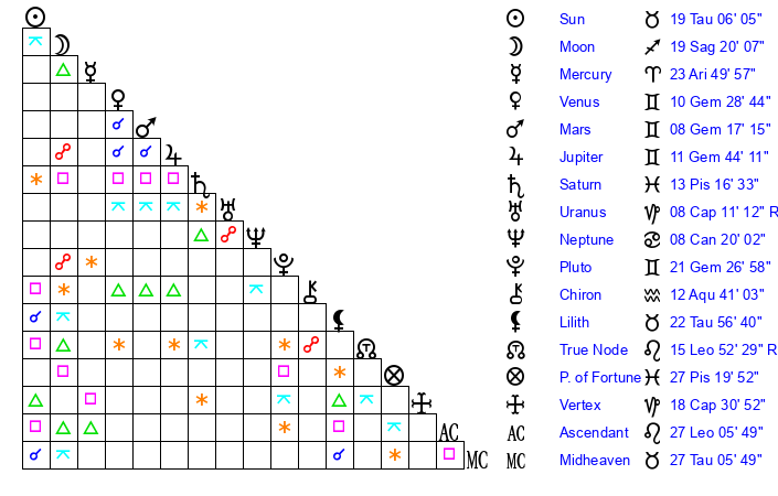 | Sun | 19 Taurus 7 | 20 Taurus 17 | 13 Virgo 10 |