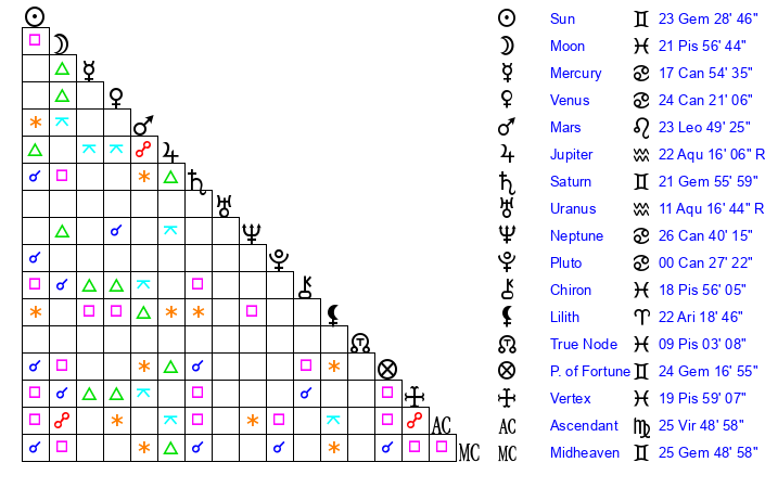 | Sun | 23 Gemini 29 | 24 Gemini 36 | 10 Libra 22 |