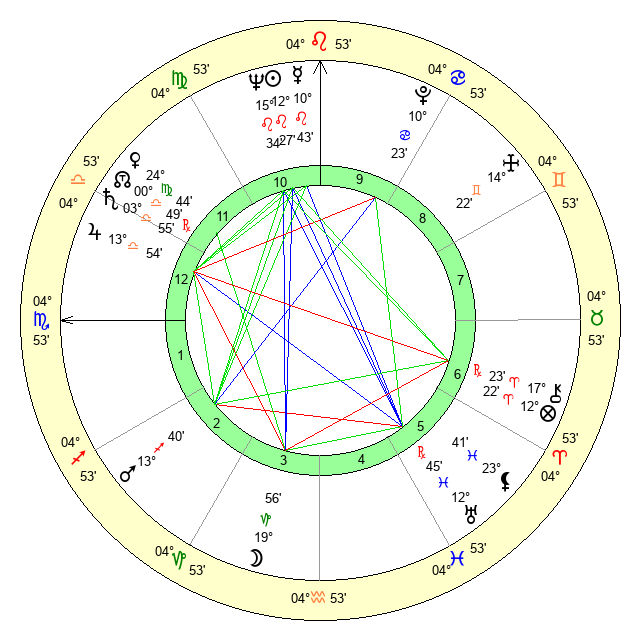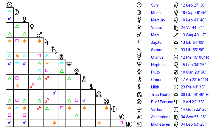 | Mercury | 10 Leo 44 | 5 Leo 52 | 12 Scorpio 8 |