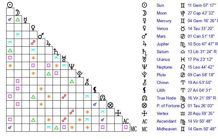 | Sun | 11 Gemini 7 | 12 Gemini 24 | 18 Virgo 54 |