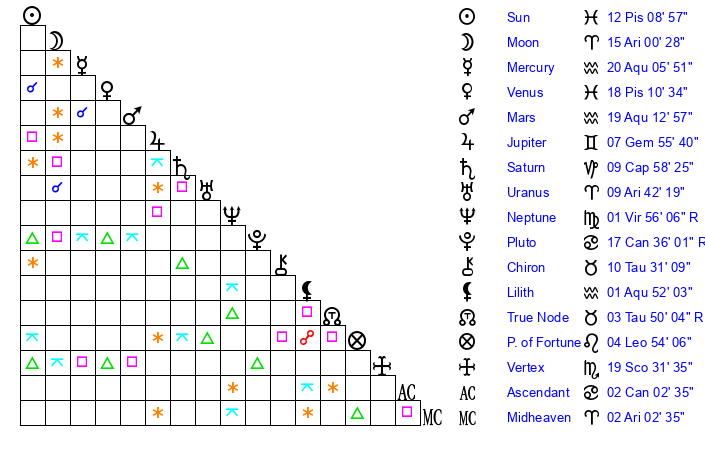 | Mars | 19 Aquarius 13 | 17 Cancer 21 | 2 Taurus 28 |