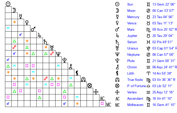 | Sun | 13 Gemini 22 | 14 Gemini 19 | 8 Libra 49 |