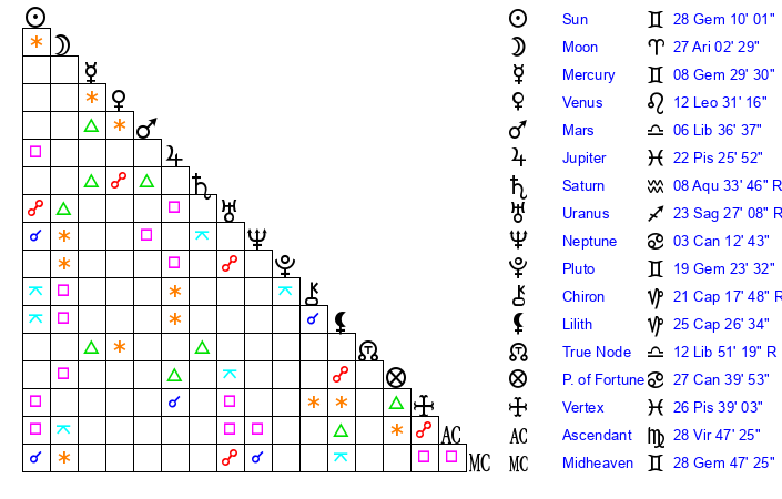 | Pluto | 19 Gemini 24 | 3 Aquarius 20 | 20 Gemini 34 |