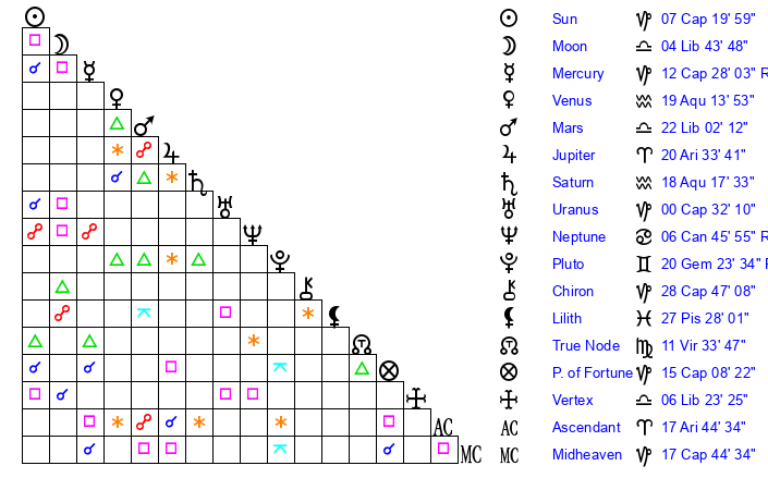 | Moon | 4 Libra 39 | 29 Aries 35 | 11 Pisces 43 |